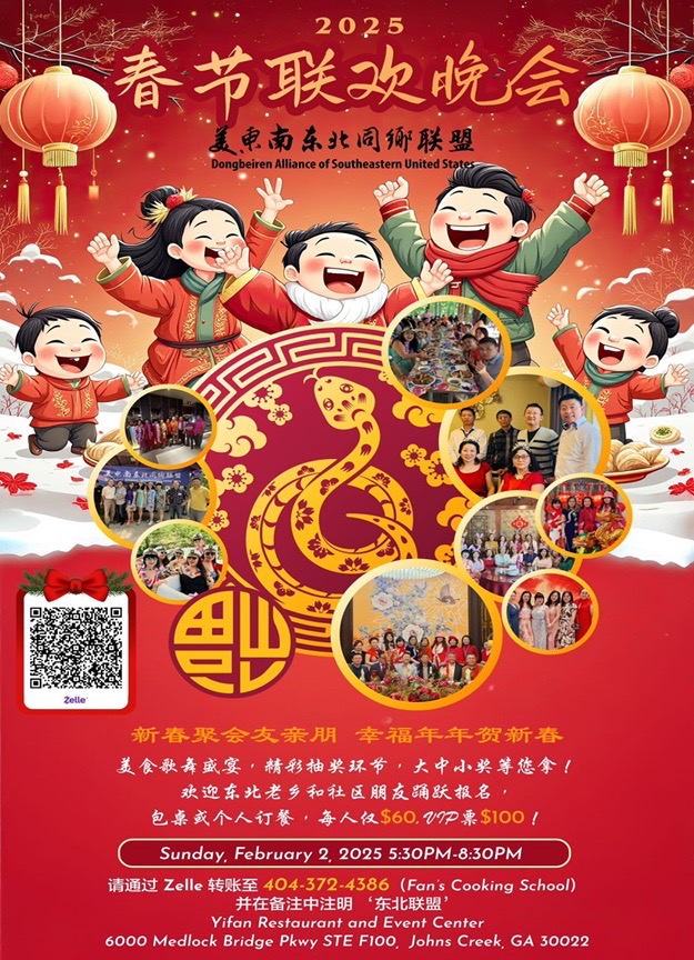 2025年2月2日,美东南东北同乡会春节联欢晚会盛大举行,亚特兰大华人经纪联盟20位成员盛装出席,热情参与,共度新春盛宴!